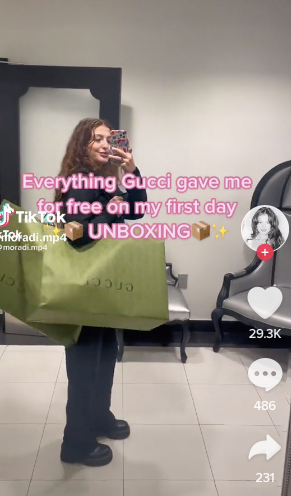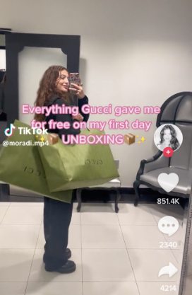 话说上月初,洛杉矶一个叫梅拉尼(Melanie Moradi)的Gucci商店店员,因为一段员工福利开箱视频走红了。
