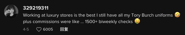 “在奢侈品店工作真的很爽,我还留着我在Tory Burch的制服,当时我半个月也领着超1500刀的薪水。”
