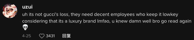 “这才不是Gucci的损失,考虑到人家是个奢牌,他们需要的是谦逊得体、能保持低调的员工,员工手册肯定都写了的”
