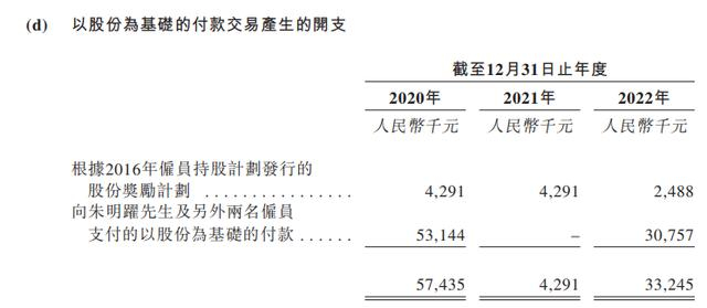 招股书显示,2020-2022年,公司向创始人朱明跃及另外两名员工支付的以股份为基础的付款分别为5314.4万元、0元和3075.7万元。红星资本局注意到,其中大部分进了创始人朱明跃的腰包,他分别拿到5314.3万元、3075.7万元。