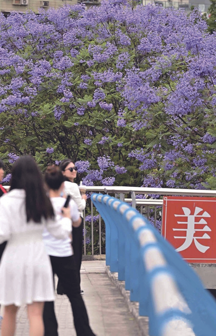 谢家湾立交,市民在蓝花楹和立交桥“交织”的“花桥”上感受紫色的浪漫。