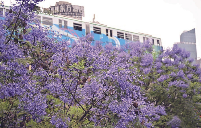 在谢家湾立交,蓝花楹和立交桥“交织”,组成了一座“花桥”。市民在桥上可以近距离地感受紫色的浪漫。谢家湾立交周围种着多株蓝花楹,目前正开得灿烂。一朵朵小喇叭似的蓝紫色花朵挂满树枝,团团簇簇、层层叠叠。当轨道交通2号线列车驶来,和盛开的蓝花楹撞个满怀,不得不说,又是一道绝美风景线。