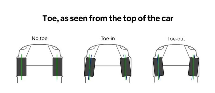 束角是指俯视车辆且车头朝上时,轮胎指向的延长线与车辆中心垂直轴的夹角。如果轮胎接近车头的一端比远离车头的一端距离更近(内八字),则此时为Toe In正束角,反之(外八字)则为Toe Out负束角。