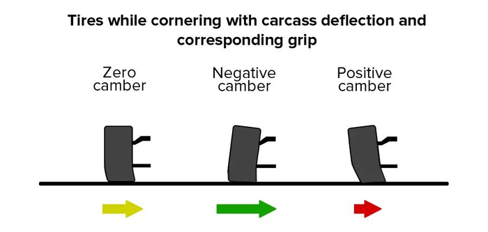这也是说在静态设置好的负外倾角之外,在弯道中还可以通过转向角度来给外侧车轮更多的负外倾角(减少内侧车轮的负外倾角)来把轮胎接触面积最大化,从而压榨更多的抓地力。