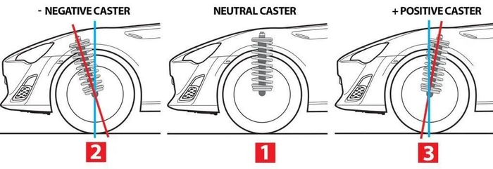 现代的量产车和赛车都带有比较大的正主销后倾角,区别就是量产车的不可调,赛车可以根据不同赛道和驾驶员的需求调整。