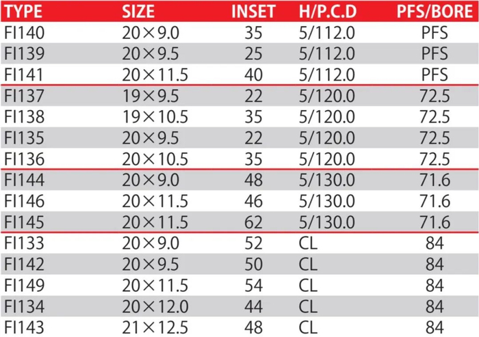 FI-R的尺寸数据19寸到21寸,孔距有5*112/120/130,基本上是主要适配以下车型: