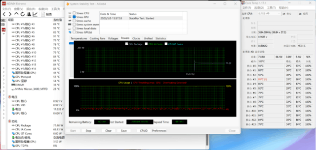 首先是AIDA64的处理器单烤,可以看到在10分钟的时间后,处理器功耗在依然保持在70W以上,温度94℃,相比于默认的45W高出了近25W,非常给力。
