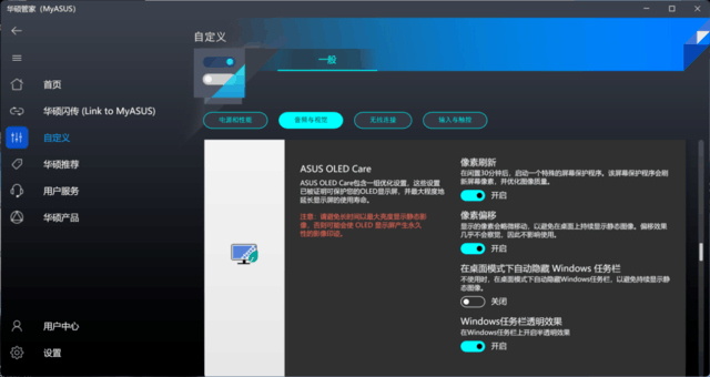 很多朋友对于OLED屏幕还存有一些担心,认为其在Windows系统下容易发生烧屏的现象,影响长期使用。对此,华硕在这款机型中做了相当多的优化,比如桌面下方的任务栏默认是半透明的,可以不用一直隐藏任务栏,系统设置、文件资源管理器的左面也是默认半透明的,尽量减少烧屏的风险。在系统内自带的MyASUS软件中,有一项专门用来提高OLED屏幕寿命的设置——ASUS OLED Care。