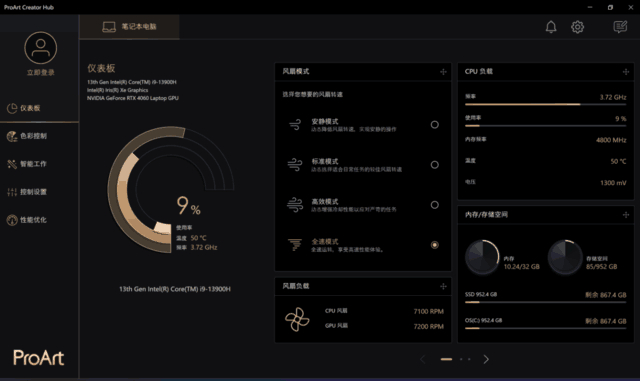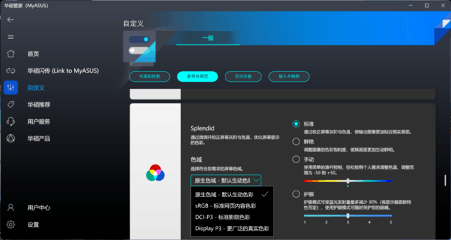 在内置的华硕管家(MyASUS)软件中,华硕提供了色域切换功能,用户可根据自己需求进行快捷切换,包括原生、sRGB、DCI-P3和Display P3模式。