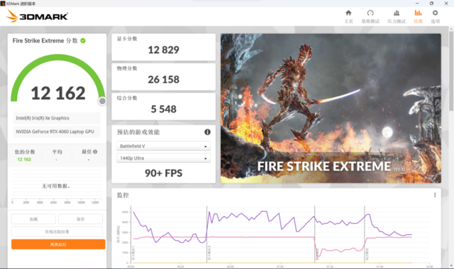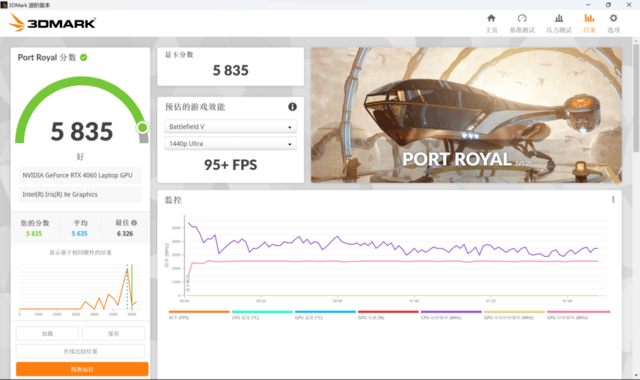 在3DMark“铁人三项”中,RTX 4060笔记本电脑GPU表现优秀,Time Spy显卡得分10338分,Fire Strike Extreme显卡得分12829分,Port Royal显卡得分5835分。