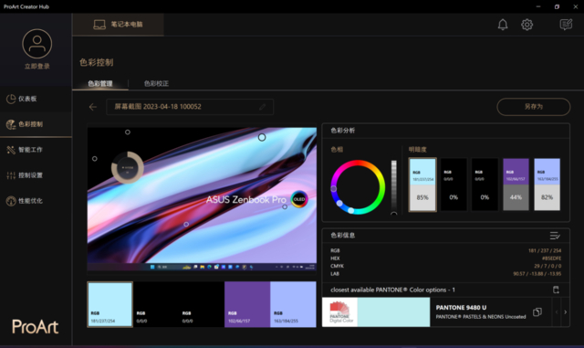 考虑到很多用户购买这台机器都是为了进行创意设计类工作,对色彩有着很高的要求,灵耀Pro14 2023的创作者中心全新升级后,提供了丰富的个性化、实用性功能,例如调色、校色、去色功能,非常专业。