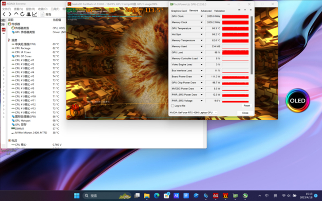 再来看双烤的情况,10分钟后,处理器核心温度为83℃,相比单烤时还更低了,功耗为25W;此时显卡温度为86.2℃,功耗为100W,整机功耗释放达到25W+100W=125W,对于这样一款全能轻薄本来说已经非常给力,看得出这套散热确实高效。