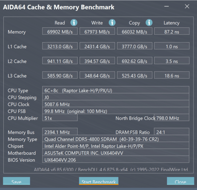 第13代酷睿的一大特点就是支持频率更高的DDR5内存,灵耀Pro14 2023搭载32GB 4800MHz高速DDR5双通道内存,在AIDA64的测试中跑出了69902MB/s读取,67973MB/s写入,66032MB/s拷贝以及87.2ns延迟的成绩,速度快延迟低,在使用中可全面助力大型应用程序的流畅运行。