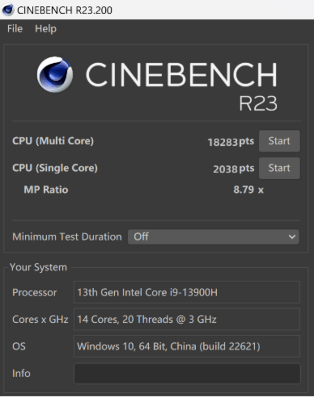 时间更长的Cinebench R23测试中,只跑一轮的情况下,这颗处理器的单核得分达到了2038分,多核成绩18283分。