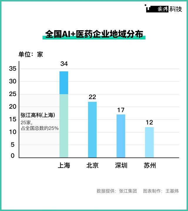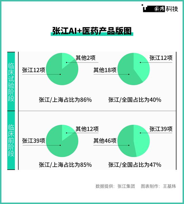 在中国AI制药版图上,“老牌药谷”上海张江占据着龙头位置,从企业数量到管线规模都领先全国。张江集团据公开披露信息统计,目前全国共有99家企业涉及AI+医药领域,其中上海34家,张江企业以25家的数量在全国占比达25%;全国AI+医药产品在临床前研究阶段和临床试验阶段的项目分别有83项和30项,而张江在全国占比分别为47%和40%。