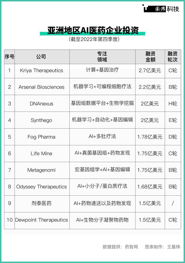 亚洲地区AI医药企业投资(截至2022年第四季度)。