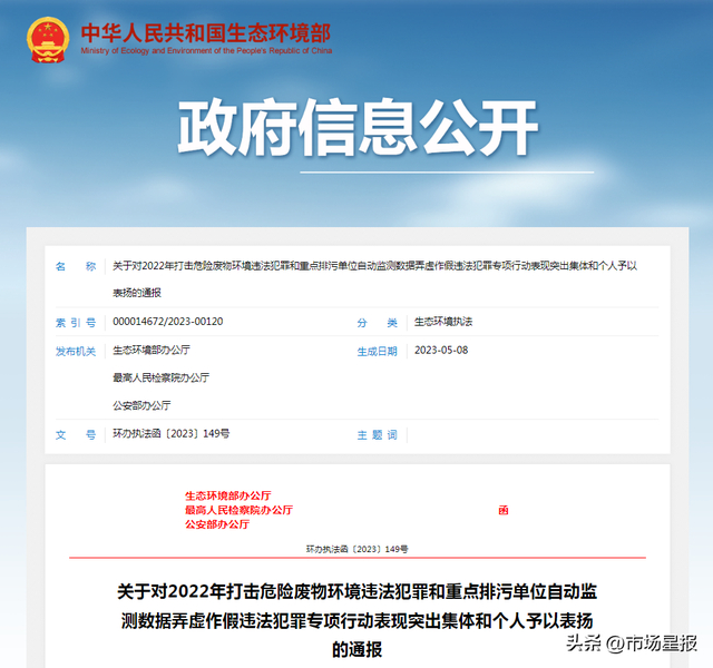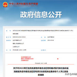 5月8日,生态环境部网站发布《关于对2022年打击危险废物环境违法犯罪和重点排污单位自动监测数据弄虚作假违法犯罪专项行动表现突出集体和个人予以表扬的通报》,对“两打”专项行动中表现突出的90个集体和150名个人予以通报表扬。