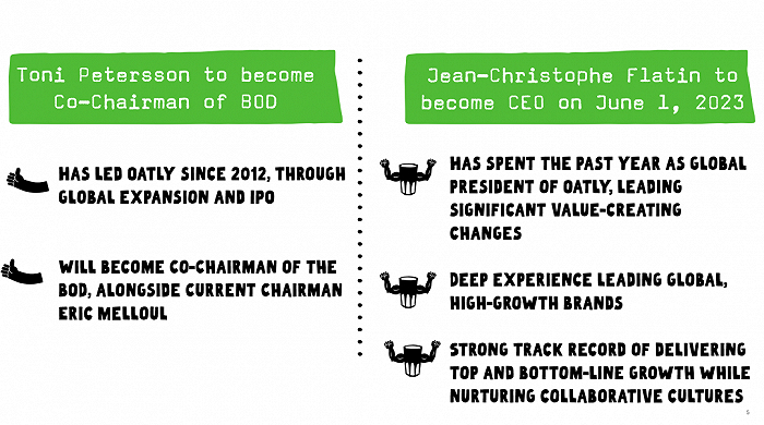 小食代留意到,刚刚,全球最大的燕麦饮品公司发布了2023年第一季度业绩,同时官宣了一个重大人事变动——Jean-Christophe Flatin将于2023年6月1日起接替Toni Petersson成为OATLY新一任首席执行官,而后者即将成为OATLY董事会联席主席。