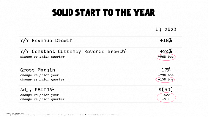 小食代翻阅的财报显示,截至2023年3月31日的第一季度,该公司收入为1.956亿美元,比上年同期增长17.7%,按固定汇率计算,收入增长23.5%。毛利率为17.4%,同比增长790个基点,环比增长150个基点。