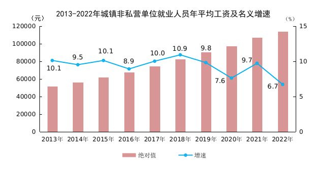 统计数据显示,2022年,全国城镇非私营单位就业人员年平均工资为114029元,比上年增长6.7%,增速比2021年回落3个百分点,扣除价格因素实际增长4.6%;城镇私营单位就业人员年平均工资为65237元,比上年增长3.7%,增速比2021年回落5.2个百分点,扣除价格因素实际增长1.7%。