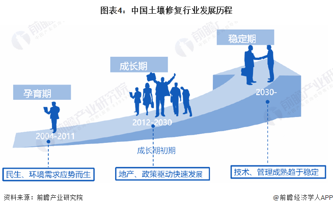 相较国外,国内土壤及地下水修复行业相对国外而言起步较晚,大致划分为三个阶段—孕育期、成长期、稳定期,我国土壤及地下水修复行业目前处于成长期。