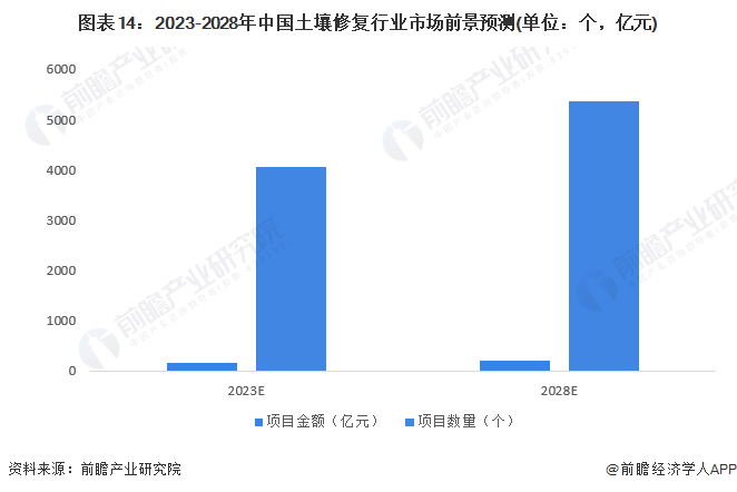 前瞻保守预计,2023年,中国土壤修复项目数量达4050个,项目总金额为168亿元;至2028年土壤修复项目5360个,项目总金额为210亿元,复合增长率在5%左右。