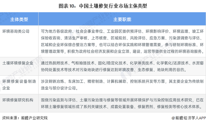 土壤修复产业的主体主要包括了环境咨询服务类公司、环境修复类公司、修复设备类公司、修复药剂类公司、环境监测类公司以及环境修复研究院等主要6类企事业单位。其中环境修复企业在资金、企业规模、企业数量方面成为土壤修复产业引领者。