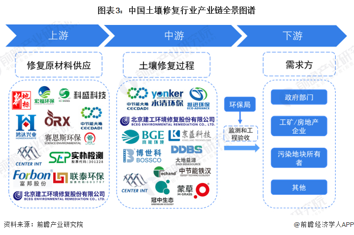 目前国内从事土壤修复的企业越来越多,由于预期土壤修复市场规模巨大,各行各业都开始往这方面发展。从产业链角度看,上游专注土壤设备研发的企业有新地标、科盛科技等;检测设备制造厂商有实朴检测、富邦股份等。在中游环节,我国土壤修复行业既有综合性企业,如建工修复、森特股份等企业产业链布局完善;也有专注于修复咨询、技术支撑、调查评估、修复工程、第三方检测等具体领域的企业,如中节能大地、京蓝科技、高能环境等。后期土壤修复工程监测和验收工作主要由各地方环保局开展。