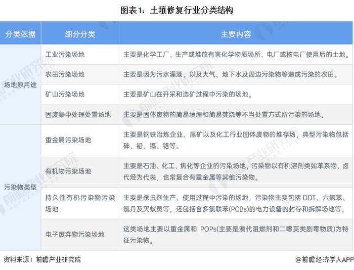 按照不同的场地用途类型或污染物类型可对土壤修复行业进行分类。