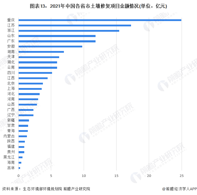 2021年国共有31个省(区、市)启动土壤和地下水修复产业项目。从项目金额来看,2021年重庆市公开招投标的项目金额最高,高达24.93亿元,排在前2-5名的江苏、浙江、广东、山东等省的项目金额在11.8亿-17.26亿元之间。