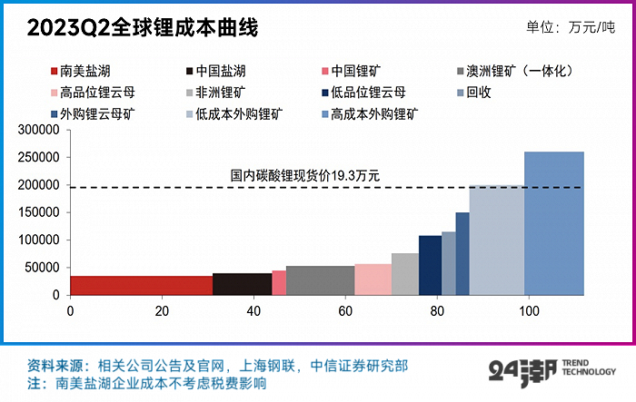 根据中信证券的统计的锂成本曲线数据,现阶段19万碳酸锂的价格目前仅出清了国内高成本外购锂矿的产能,而占据产能绝大部分的南美、国内盐湖以及一体化锂矿的碳酸锂成本都比较低,远未到出清的阶段,包括外购锂云母矿的成本目前仍在15万元/吨以下,而目前采用澳洲高成本的锂辉石精矿以及国内中低品位的锂云母矿作为原料生产碳酸锂的成本约为10万元/吨,这些企业仍拥有丰厚利润。