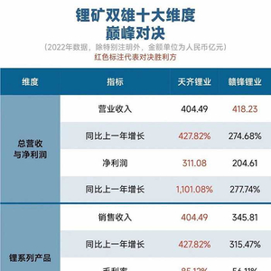 其中天齐锂业在净利润及增速、毛利率与增长、投资收益、造血力与资本实力、人均创收与人均薪酬 等22项指标对决中胜出;而赣锋锂业在总营收与海外销售、对外投资规模、锂系列产品产能、员工规模 等15项指标对决中占据优势,具体详见下表: