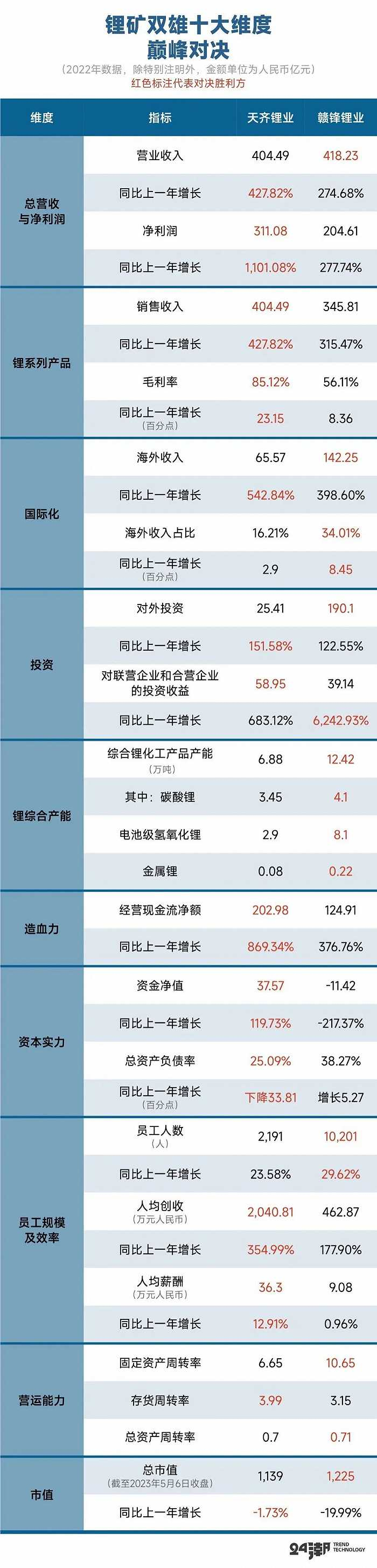 为了读者朋友能更为客观、全面的了解锂矿双雄的真正实力与竞争力,24潮团队统计了天齐锂业与赣锋锂业2022年锂产品销量与毛利率、产能与投资、造血力与资本实力、员工创收力与人均薪酬、营运能力与国际化等37项核心指标,供读者朋友参考。