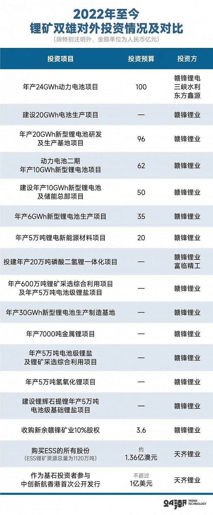 2022年以来,锂业双雄投资策略更是出现两极分化。据24潮统计,2022年以来,赣锋锂业加速构建一体化版图,2022年至今赣锋锂业对外至少公布了15个投资计划,涵盖锂矿采选、锂盐、锂电材料、锂电池制造等多个领域,总投资规模超500亿元,攻势非常凶猛。