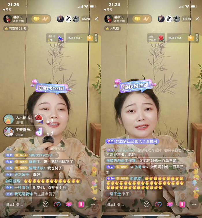 事实上,不仅是谢彦巧,抖音直播间也成为了更多戏曲人的“第二舞台”。在抖音直播间里,还有更多和她一样的“追梦人”。