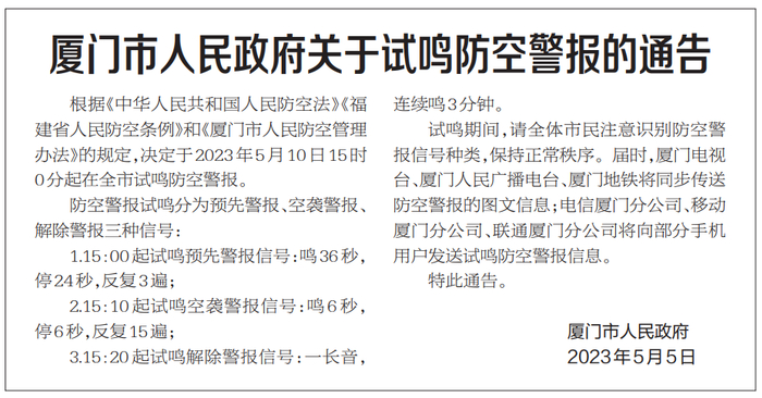 根据《中华人民共和国人民防空法》《福建省人民防空条例》和《厦门市人民防空管理办法》的规定,2023年5月10日15:00至15:30,厦门地铁启动车站及列车防空警报试鸣。在试鸣期间,请市民乘客不必惊慌,正常有序乘车,谢谢配合,不便之处敬请谅解!