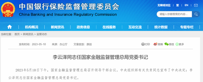 据银保监会网站,2023年5月10日下午,国家金融监督管理总局召开领导干部会议。中央组织部有关负责同志宣布了中央决定:李云泽同志任国家金融监督管理总局党委书记。