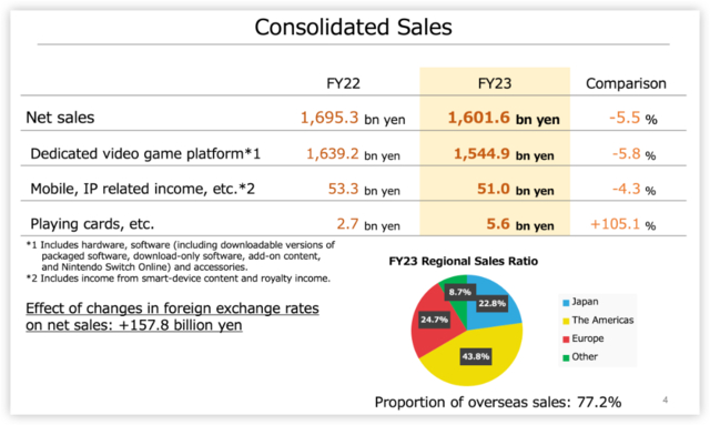 游戏机相关收入(含硬件、软件及追加内容等)为1.54万亿日元,同比减少5.8%。其中,日本本土销售额占比22.8%,海外销售额占比77.2%,美洲市场仍为最大单一市场,对任天堂营收贡献高达43.8%;