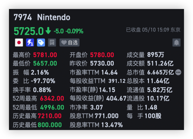 截至今日(5月10日)日股收盘,任天堂微跌0.09%。
