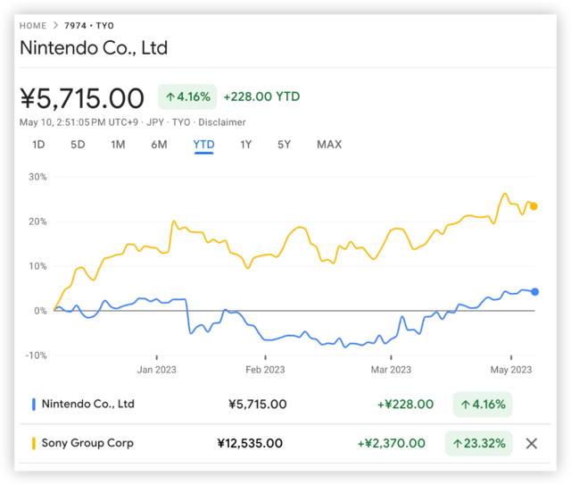 今年以来,任天堂股价累涨4%,而索尼则涨超23%。