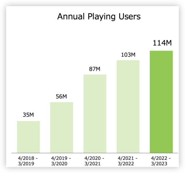 各项主要财务指标下滑之际,年度付费用户数量是任天堂财报中为数不多的亮点,本财年年度付费用户由上年的1.03亿增至1.14亿。显示出宝可梦、马里奥、喷射战士等畅销IP经久不衰的生命力。