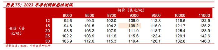 铜钴业务,假设TFM铜钴矿2023-2025年铜金属销量为36/45/45万吨,钴金属销量为2.25/3.0/3.7万吨;假设KFM铜钴矿2023-2025年铜金属销量为8.0/9.0/9.0万吨,钴金属销量为2.7/3.0/3.0万吨。假设2023-2025年铜价分别为9000/9100/9200美元/吨,钴价分别为15/13/12美元/磅;