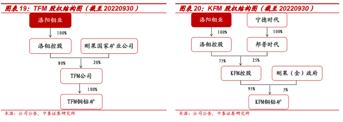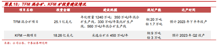 铜钴资源丰富,产能加速扩张。公司拥有刚果(金)TFM 和 KFM 两大优质铜钴矿,合计拥有铜资源量 3525 万吨,钴资源量 555 万吨,目前具备铜产量 25 万吨+钴产量 2 万吨,依托于 TFM 混合矿以及 KFM 项目的投产,公司将具备铜产能 54 万吨以上+钴产能 6.7 万吨,较目前25.43 万吨铜产量+2.03 万吨钴产量规模实现翻倍式增长,成为全球第一大钴生产商和领先的铜生产商。