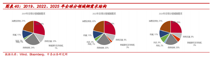 经济复苏叠加新能源需求将持续拉动铜需求。在“碳中和”背景下,光伏与新能源车的行业景气度提升,新能源将转变铜金属下游消费结构。建筑、传统交通、传统电网的用铜需求由2019年的64%逐渐下降到2025年的53%;而新能源部分,2019年光伏、风电、新能源车及充电桩用铜需求占比约4%,预计2022年有望提升至8%,预计2025年或将提升至15%。