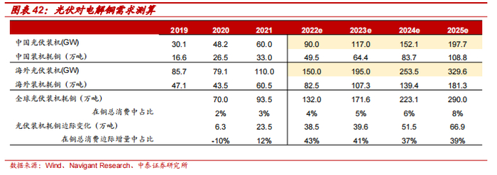 根据我们的测算,预计 2023-2024 年全球光伏装机耗铜量分别为171.6 万吨、223.1 万吨。我们预计 2022-2023 年全球光伏装机耗铜量占铜总消费的 5%和 6%,光伏装机耗铜边际增加 39.6 万吨和51.5 万吨,在铜消费边际增量占比 41%和 37%。
