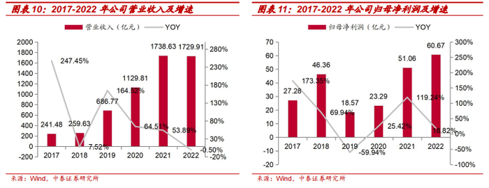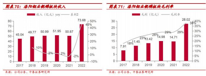 公司完成项目收购后,依托中国优势的选矿技术,降低成本、提高效率、推进铌铁回收率提升。21年公司铌产量为8586金属吨、磷肥产量111.70万吨,21年实现净利润5.81亿元,净利率为11.43%。22年受益于铌、磷肥产品价格走高,巴西铌磷板块净利润大幅提升,22年实现营业收入73.68亿元(yoy+45%),毛利率由29%提升至38%,实现净利润16.37亿元(yoy+94%)。