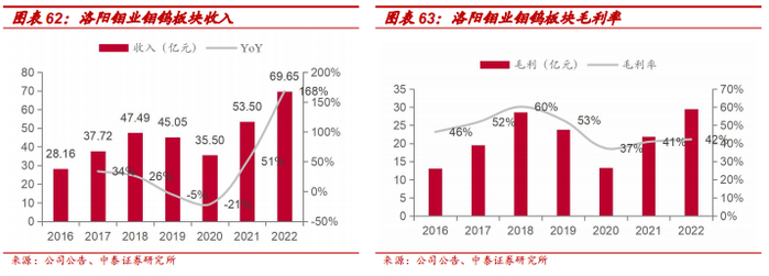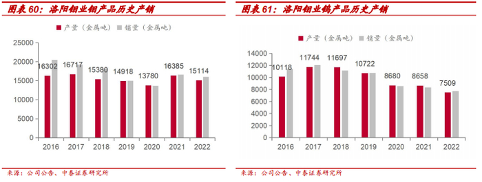 钨钼板块,最早开始于1969年,2012年公司A股上市时钼钨业务收入占比达65%。公司是全球前七大钼生产商及最大白钨生产商之一,钼资源量约138万吨、钨资源量约12万吨。2022年钼产量15114吨,钨产量7509吨;预计2023年钼产量1.20-1.50万吨,钨产量0.65-0.75万吨。
