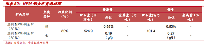 NPM 铜金矿位于澳大利亚,主要产品为铜精矿、副产品为黄金,是澳大利亚第四大在产铜金矿。公司于 2013 年开始布局海外业务,以 56亿元收购澳洲 NPM 铜金矿,目前持有 NPM 铜金矿 80%权益。NPM铜金矿拥有矿石储量 1.01 亿吨,铜平均品位 0.53%。