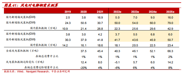 根据 Navigant Research 数据,单位 GW 海风和陆风装机耗铜分别为 0.95 万吨和 0.35 万吨。根据我们的测算,预计 2023-2024年全球风电装机耗铜量分别为 46.1 万吨、52.1 万吨。2023-2024年全球风电装机耗铜占比 1%和 1%,占铜消费边际增量 6%和 4%。根据 Navigant Research 数据,单位 GW 光伏装机耗铜 0.55 万吨。