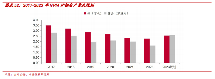 铜金板块,公司拥有澳洲NPM铜金矿80%权益,铜资源量约290万吨,金资源量约100吨,随着E31 和 E31 北矿体投产,2023年产量有所恢复,预计NPM铜产量2.4-2.7万吨,金产量2.5-2.7万盎司。